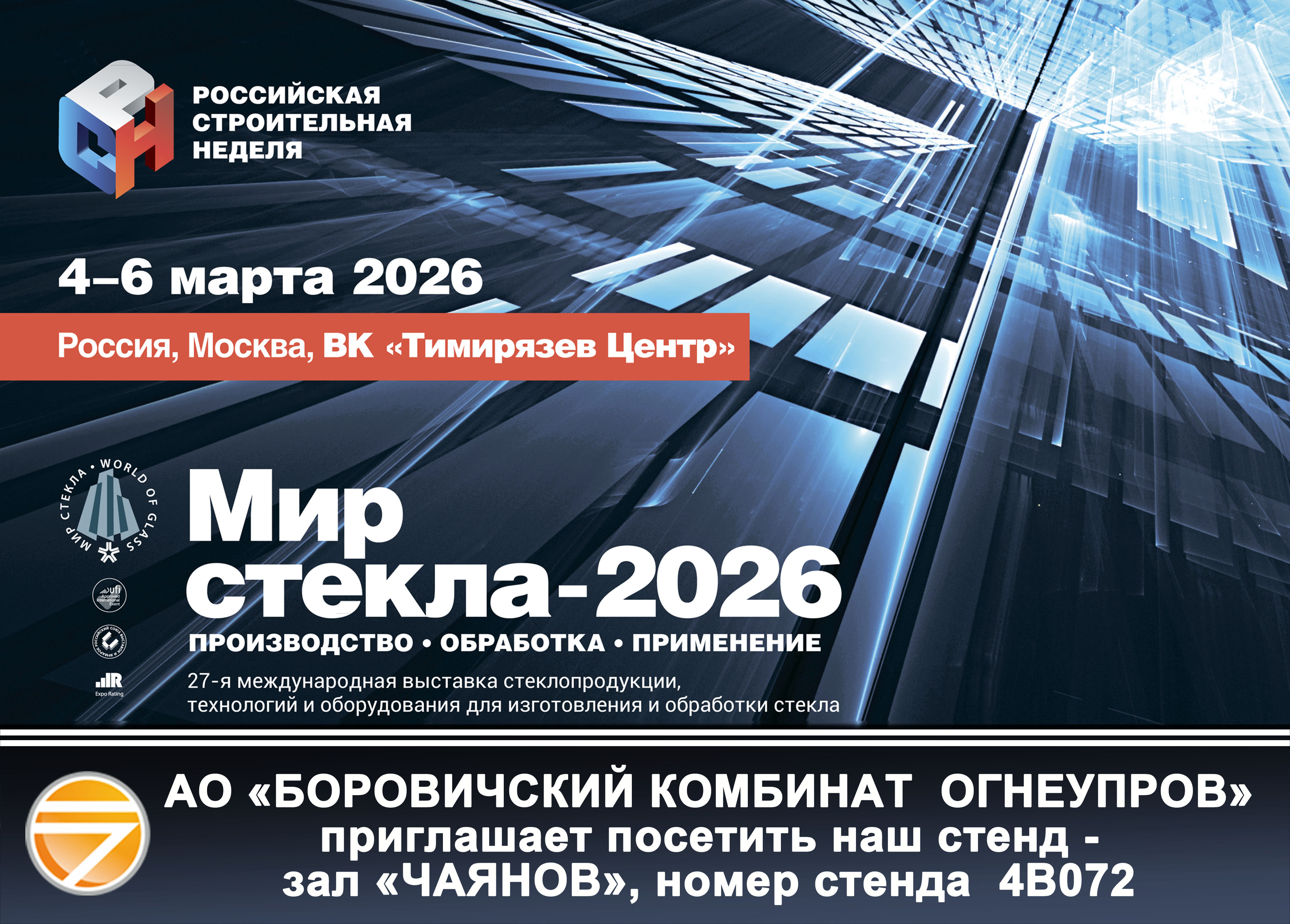 C 04 по 06 марта представители АО «Боровичский комбинат огнеупоров» принимают участие в 27-й международной выставке «Мир стекла-2026», которая проходила в ВК «Тимирязев Центр» в Москве.